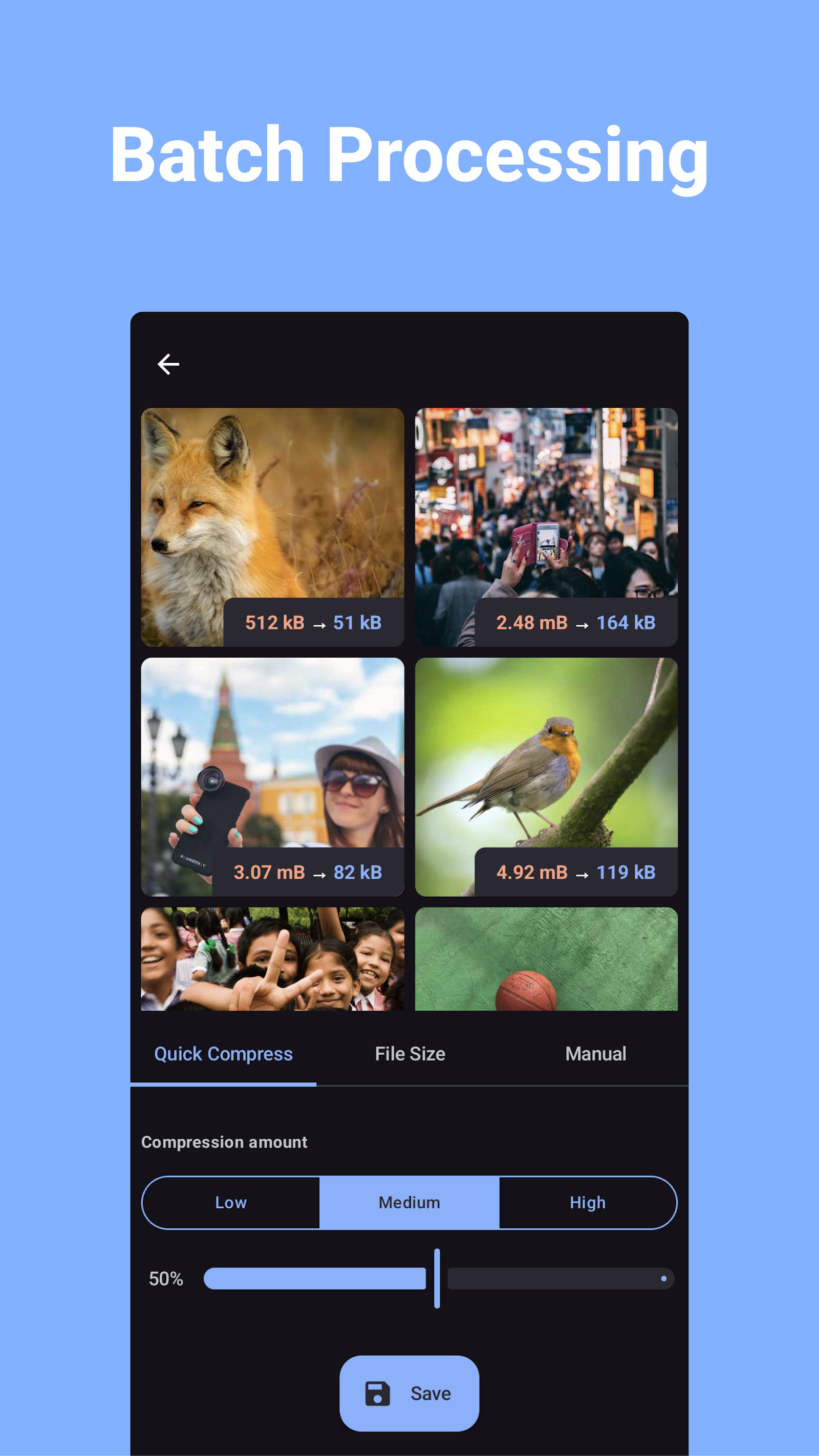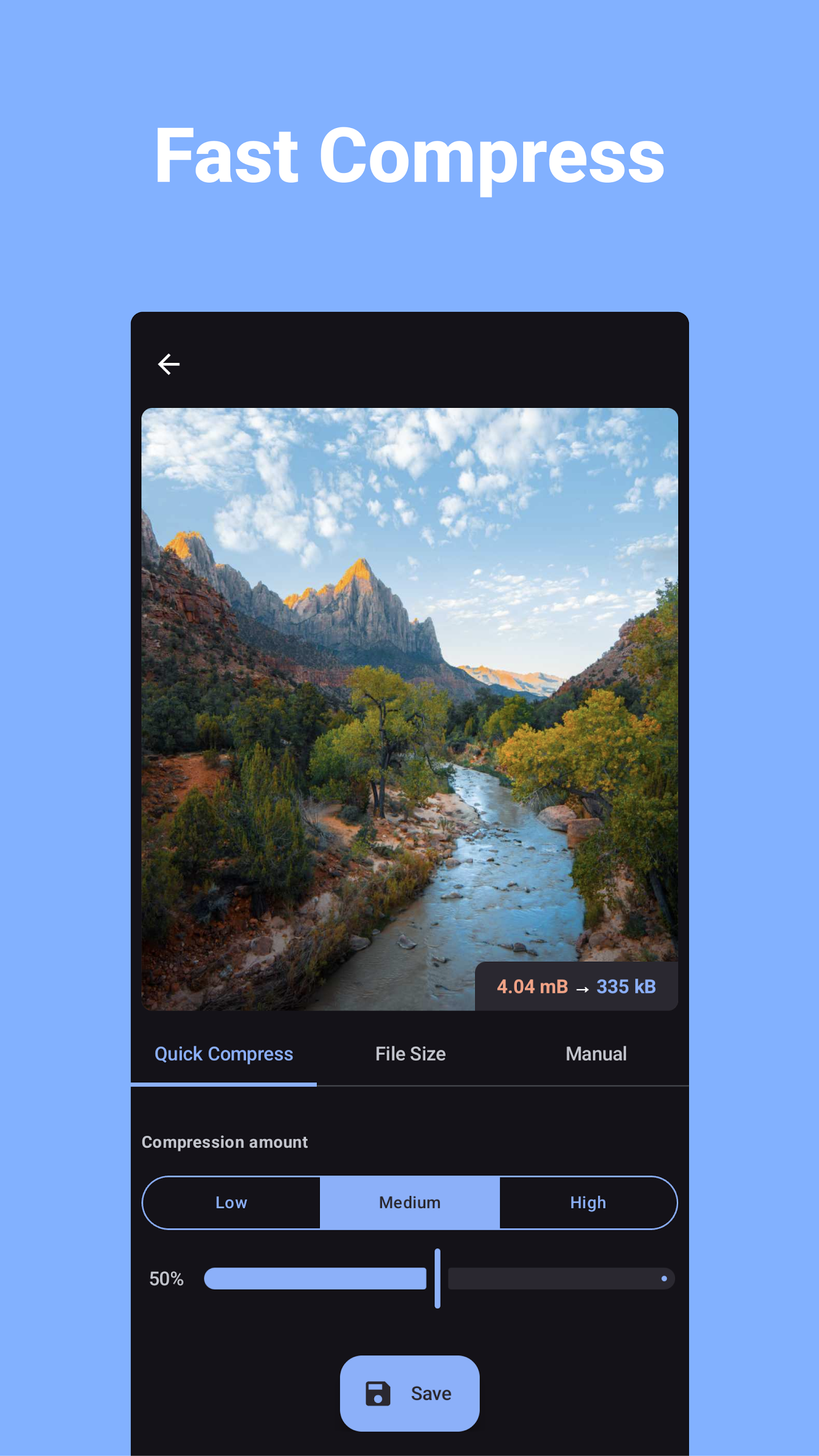 Compress Image - MB в KB — мощный компрессор изображений с удобным интерфейсом и быстрой отдачей при пакетной обработке. Ты выбираешь несколько фото или целую папку устанавливаешь уровень сжатия от лёгкого до агрессивного запускаешь процесс и наблюдаешь как мегабайты сменяются килобайтами без заметной потери деталей. В повседневной работе это выглядит просто и предсказуемо: набор фото с отпуска, оптимизация до 70 процентов и освобождённое место для новых снимков или резервных копий. За пару минут можно обработать альбом сравнить варианты с разными настройками увидеть реальную экономию и почувствовать свободу от переполненной памяти что подталкивает вернуться регулярно.
