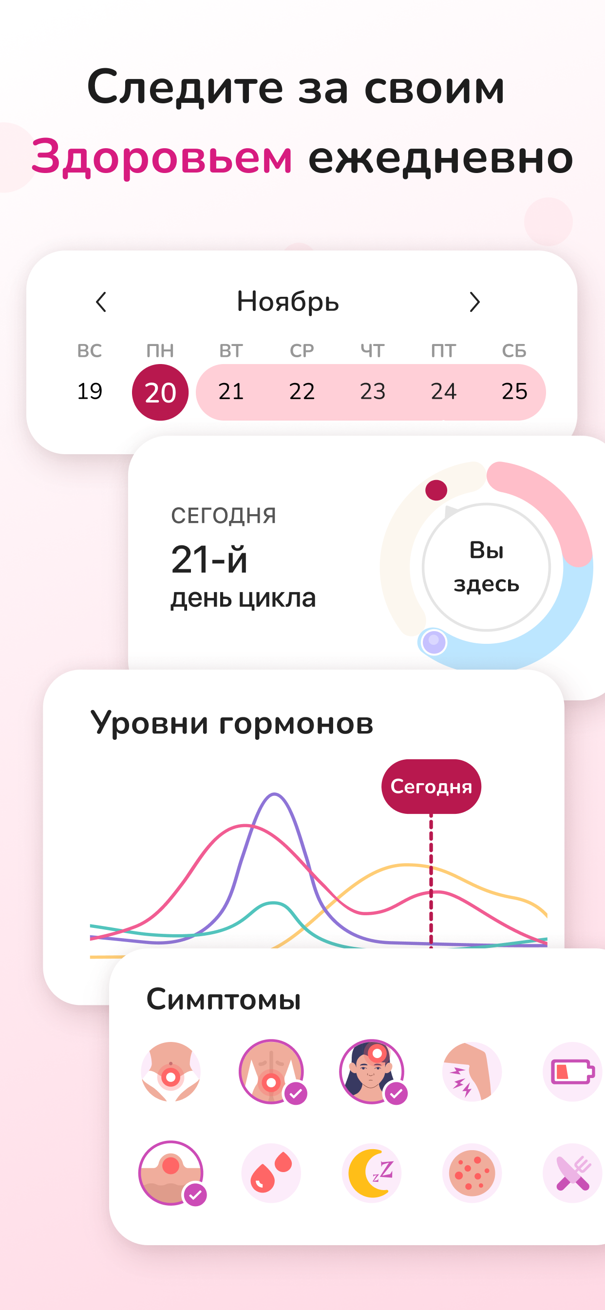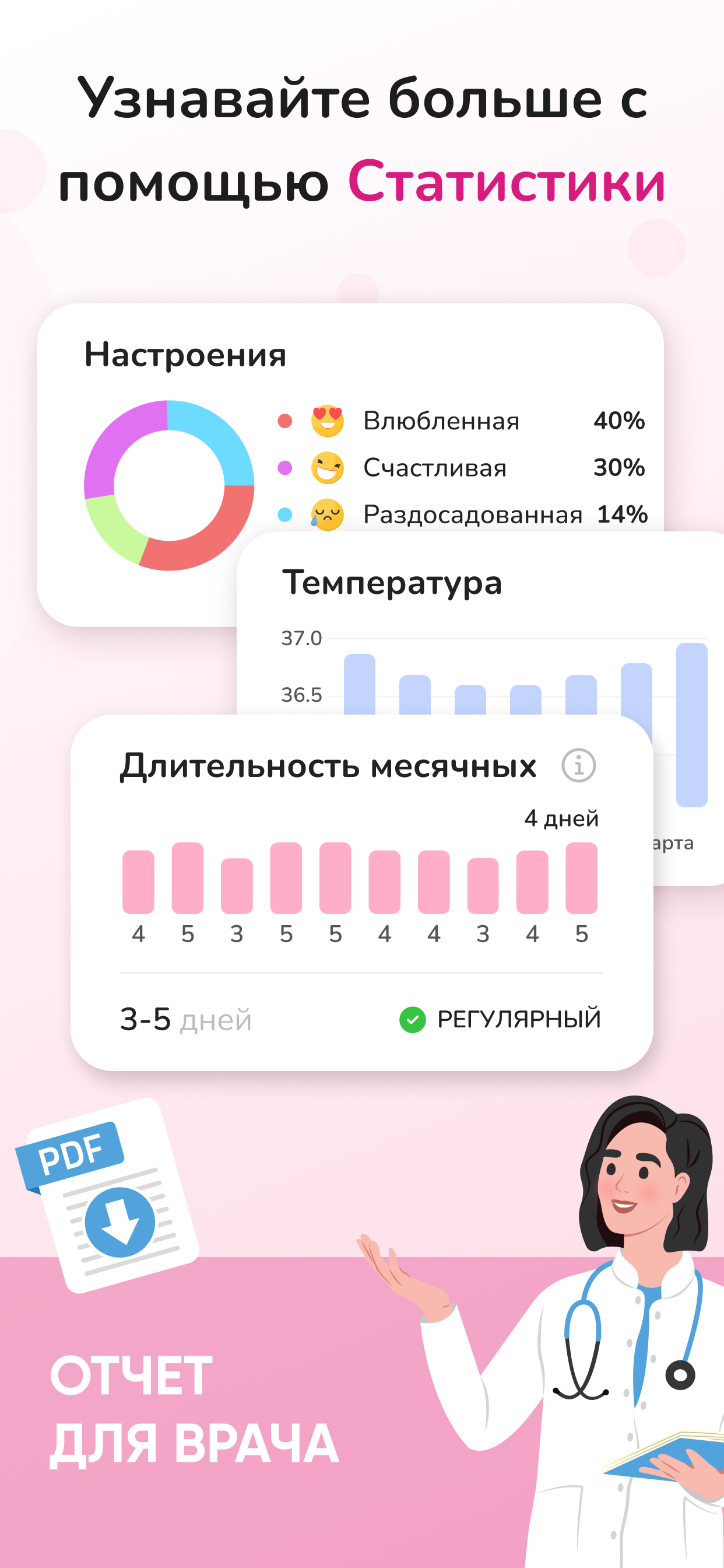 В основе приложения работает автоматический трекинг который подстраивается под тебя и улучшает предсказания с каждой отметкой. Есть напоминания о начале фертильного окна ПМС или задержке что помогает планировать дела и визиты к врачу. Видно подробную статистику по средней длине цикла вариациям и симптомам чтобы понять закономерности и следить за здоровьем. Прогресс выражается в спокойствии и уверенности ты получаешь контроль над циклом и пользуешься удобным инструментом постоянно.