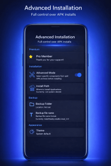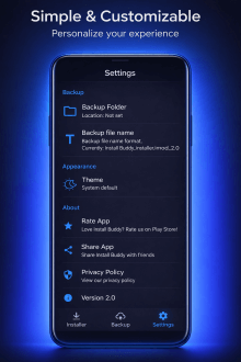 Install Buddy это простой и понятный установщик пакетов Android где любой файл превращается в одну операцию и не требует сложных манипуляций. Ты открываешь приложение выбираешь APK XAPK APKS или APKM из памяти нажимаешь установить и наблюдаешь как процесс идёт плавно и быстро. Интерфейс минимален и лишён лишних шагов поэтому даже если у тебя десяток файлов они проходят один за другим без заминок. В этой текучке появляется небольшая интрига ведь иногда пакет содержит OBB и ты видишь как система справляется с ним сама без подсказок или лишних диалогов.