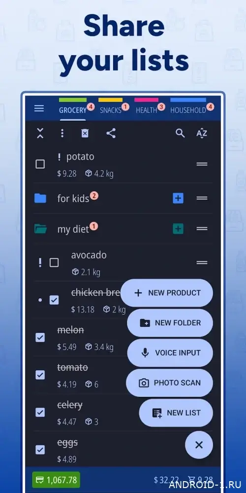 Дальше — порядок и прозрачность для планирования и экономии. Папки для разных магазинов и событий виджет на главный экран сортировки избранное и быстрые заготовки помогают собирать список в пару касаний. Есть история покупок и сводка трат чтобы увидеть картину за месяц и скорректировать расходы. Сильные стороны — голосовой ввод ИИ который понимает количества единицы и цены и сканер штрих-кодов для мгновенного добавления позиций. Наводишь порядок экономишь время и держишь бюджет под контролем без лишних аккаунтов.