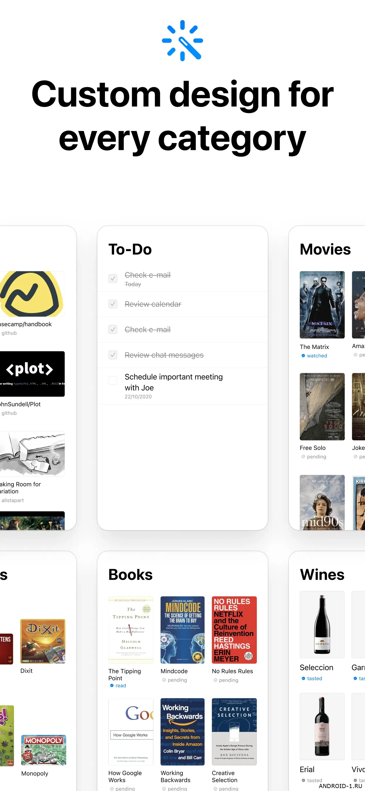Listy · Список и отслеживание помогает держать всё под рукой без регистрации и облачных сервисов. Ты создаёшь категории для фильмов книг видеоигр сериалов настольных игр вина пива или любых ссылок добавляешь записи отмечаешь просмотренное или прочитанное и видишь прогресс. Каждый раздел получает свой стиль оформления что делает список визуально приятным и понятным. За пару минут можно отметить фильм как просмотренный добавить игру в план или сохранить ссылку на книгу и сразу увидеть что ждёт дальше благодаря простому интерфейсу и понятной логике взаимодействия.