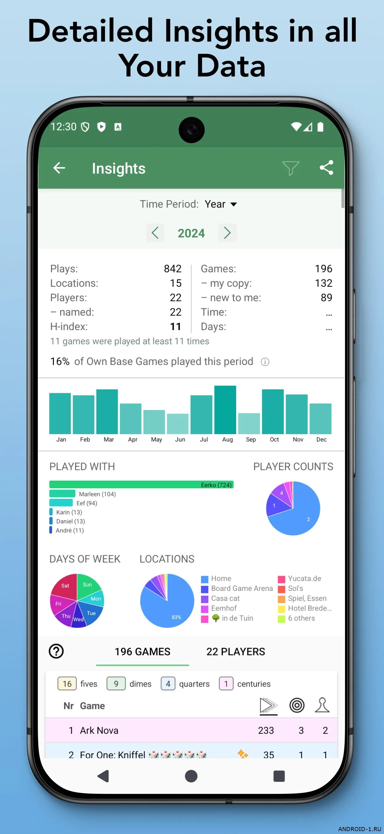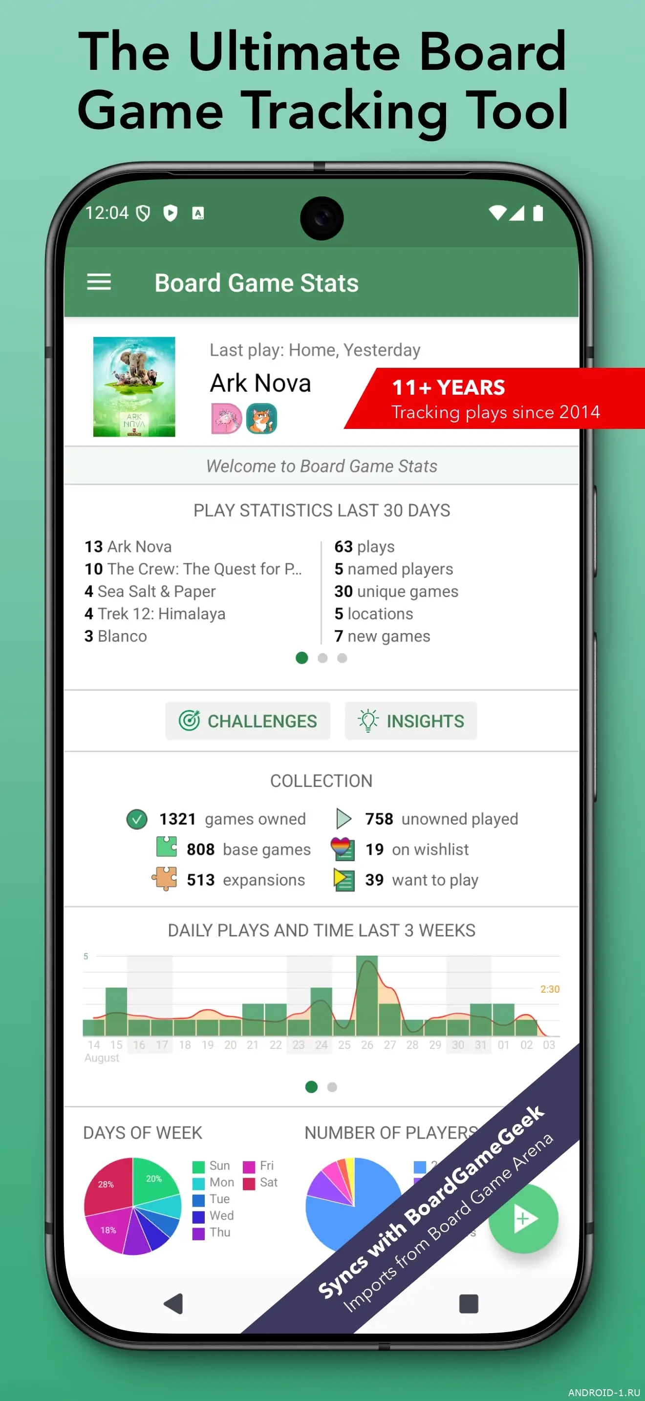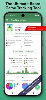 Внутри приложения есть трекер партий с готовыми шаблонами для тысяч игр и автоподсчёт очков, визуальные диаграммы показывают тенденции и помогают видеть прогресс. Двусторонняя синхронизация с внешними базами поддерживает актуальность коллекции, экспорт позволяет сохранить данные в удобном виде, а простая система прогрессии показывает реальный прирост навыков в числах. Пользователь получает ясную картину сильных и слабых сторон, понятный контроль роста и уверенное ощущение результата.