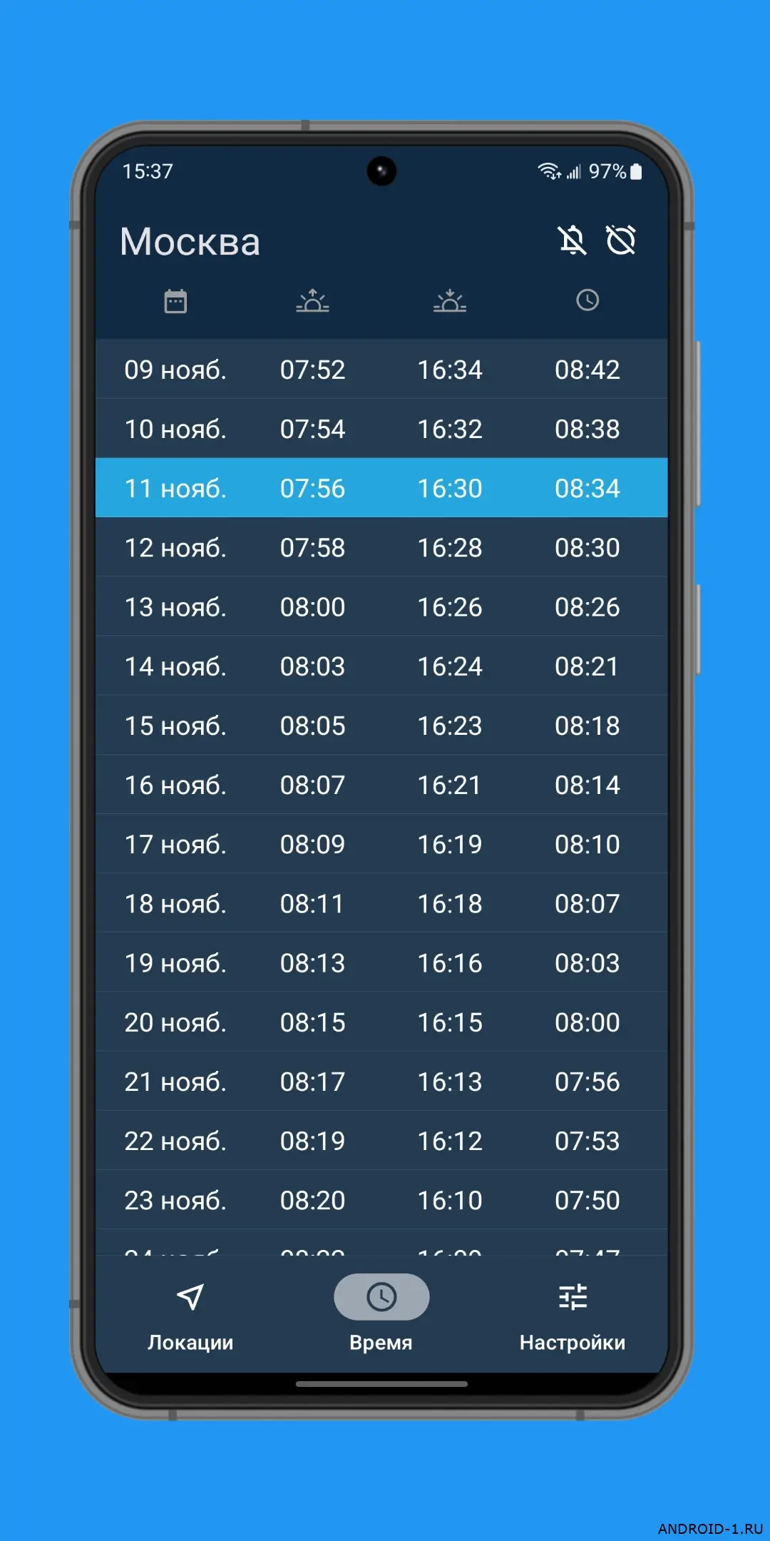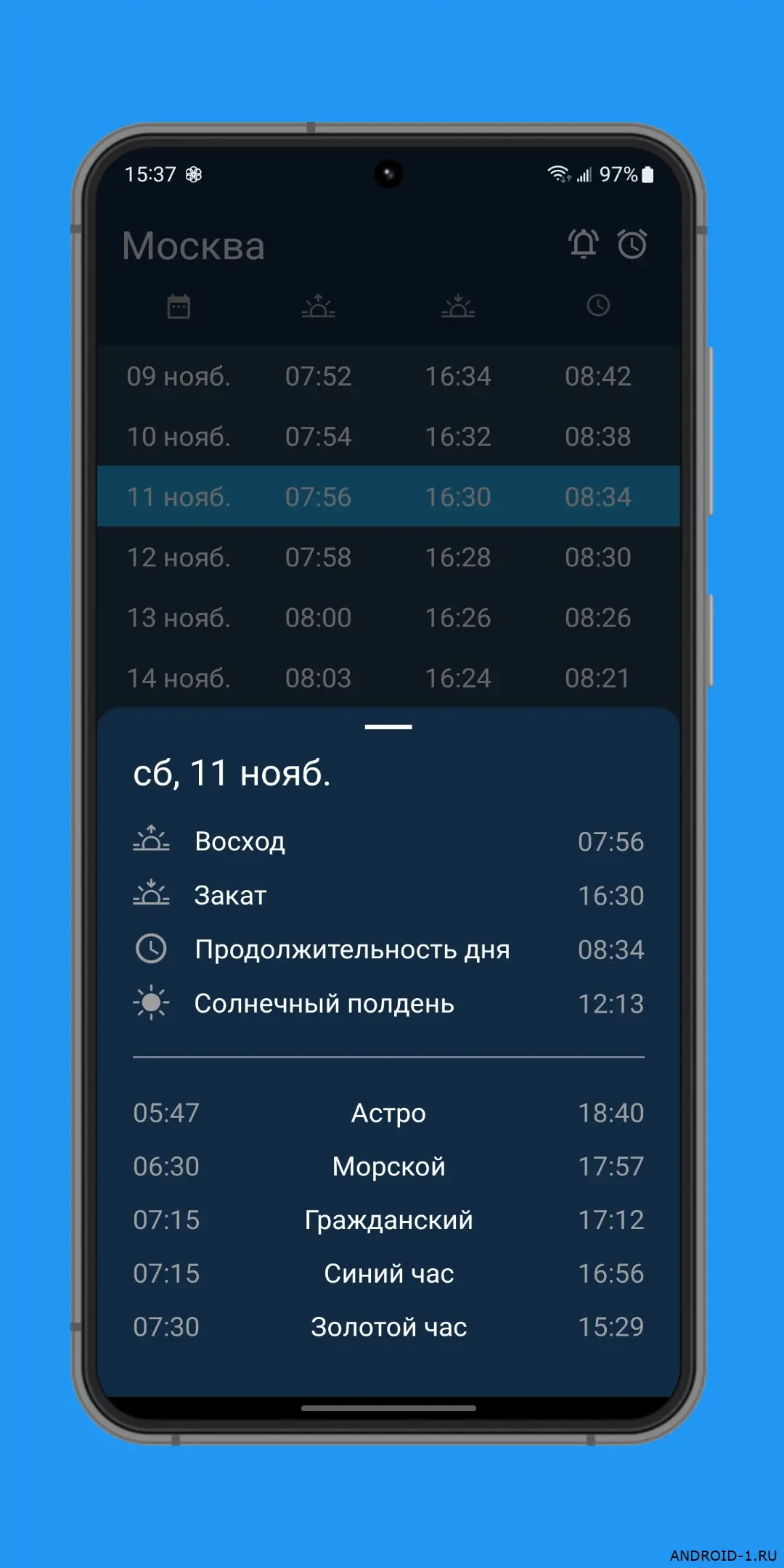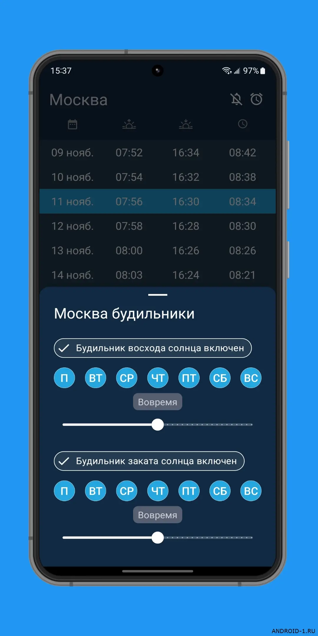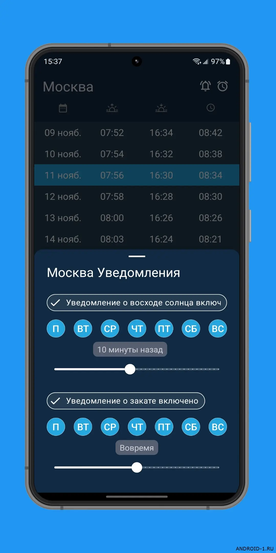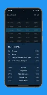 Время восхода солнца — простое и точное приложение которое показывает времена рассвета заката сумерек и золотого часа для любого места на Земле. Ты выбираешь город или точку на карте и сразу видишь расписание на сегодня и ближайшие дни, а уведомления приходят вовремя чтобы не пропустить важный момент. В каждом дне открываешь приложение и видишь точные минуты восхода и заката в твоём регионе, легко планируешь фотосессии прогулки или просто красивые встречи, и это затягивает потому что данные всегда актуальны и не нужно лишних действий.