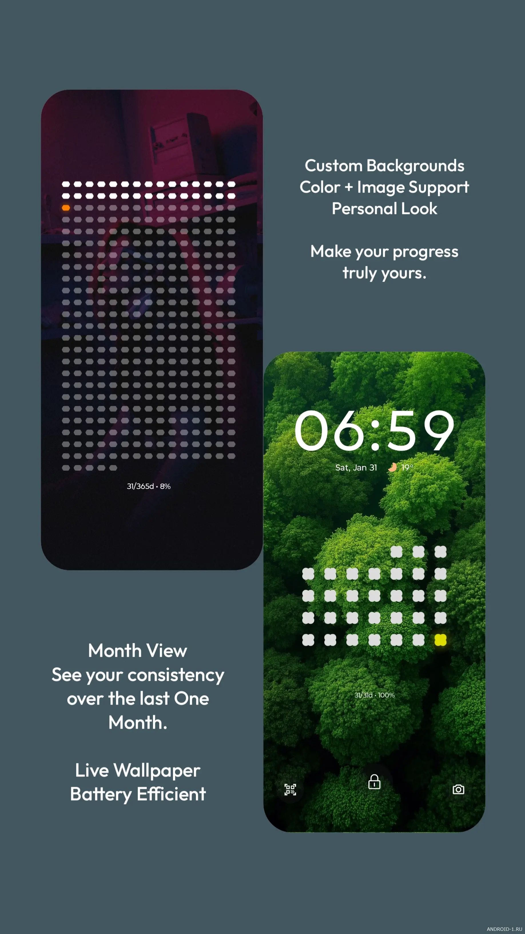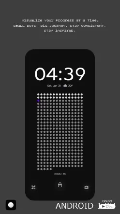 OneDot превращает домашний экран в спокойный счётчик дней и привычек, где каждая точка несёт смысл. Простая сетка показывает год, месяц или личную цель, а подсвеченная точка скользит по ней и отмечает момент сейчас, помогая увидеть прогресс без лишнего шума. В игре с визуальными ритмами ты быстро втягиваешься: ставишь цели, наблюдаешь за их визуализацией и корректируешь повседневные решения, пока интерфейс остаётся легким и ненавязчивым, создавая чувство порядка и контроля над временем.