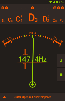 gStrings это хроматический тюнер для Android который слушает через микрофон и помогает быстро привести инструмент в строй. Открываешь приложение, выбираешь ноту или набор струн, извлекаешь звук и смотришь как индикатор реагирует; при попадании в тон он загорается зелёным и остаётся стабильным. Основной цикл прост и понятен: сыграл, видишь отклонение, подстраиваешь колок или щипок и снова проверяешь. Встроенная индикация частоты и визуальная шкала показывают мелкие потери и лишние обертоны, поэтому даже если ты на слух сомневаешься, инструмент быстро перестаёт скользить и начинает звучать ровно и предсказуемо.