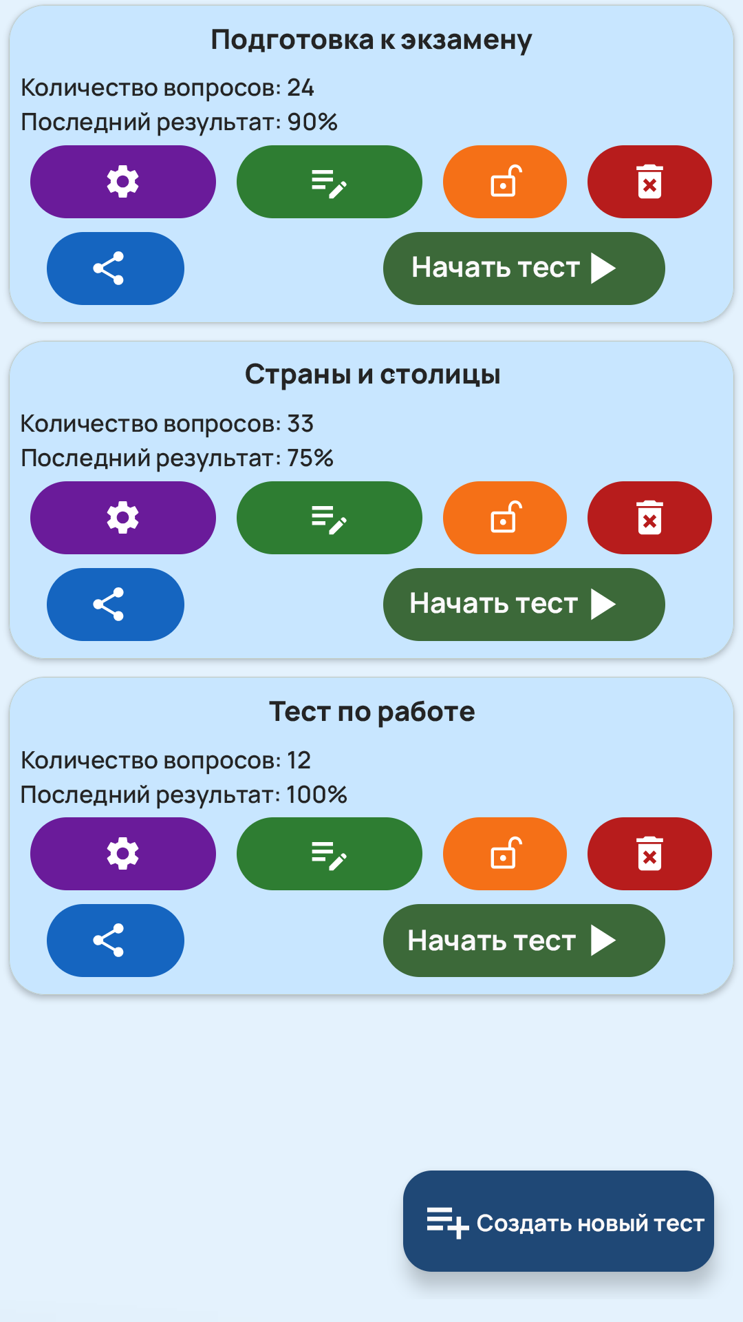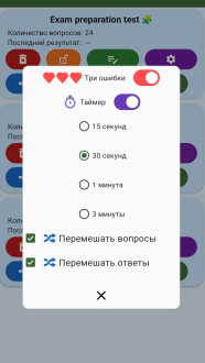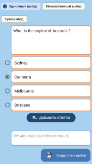 В приложении есть 7 вариантов ответов для глубокого тестирования и обмен с другими чтобы учиться вместе и получать обратную связь. Интерфейс не отвлекает и помогает создавать библиотеку заданий для экзаменов и повторений, сортировать по темам и быстро вносить правки. Прогресс виден в количестве пройденных тестов и уверенности при ответах, а гибкость настроек делает инструмент пригодным и для школьных занятий и для самостоятельной подготовки. Это рабочий инструмент для тех кто берёт учёбу всерьёз.
