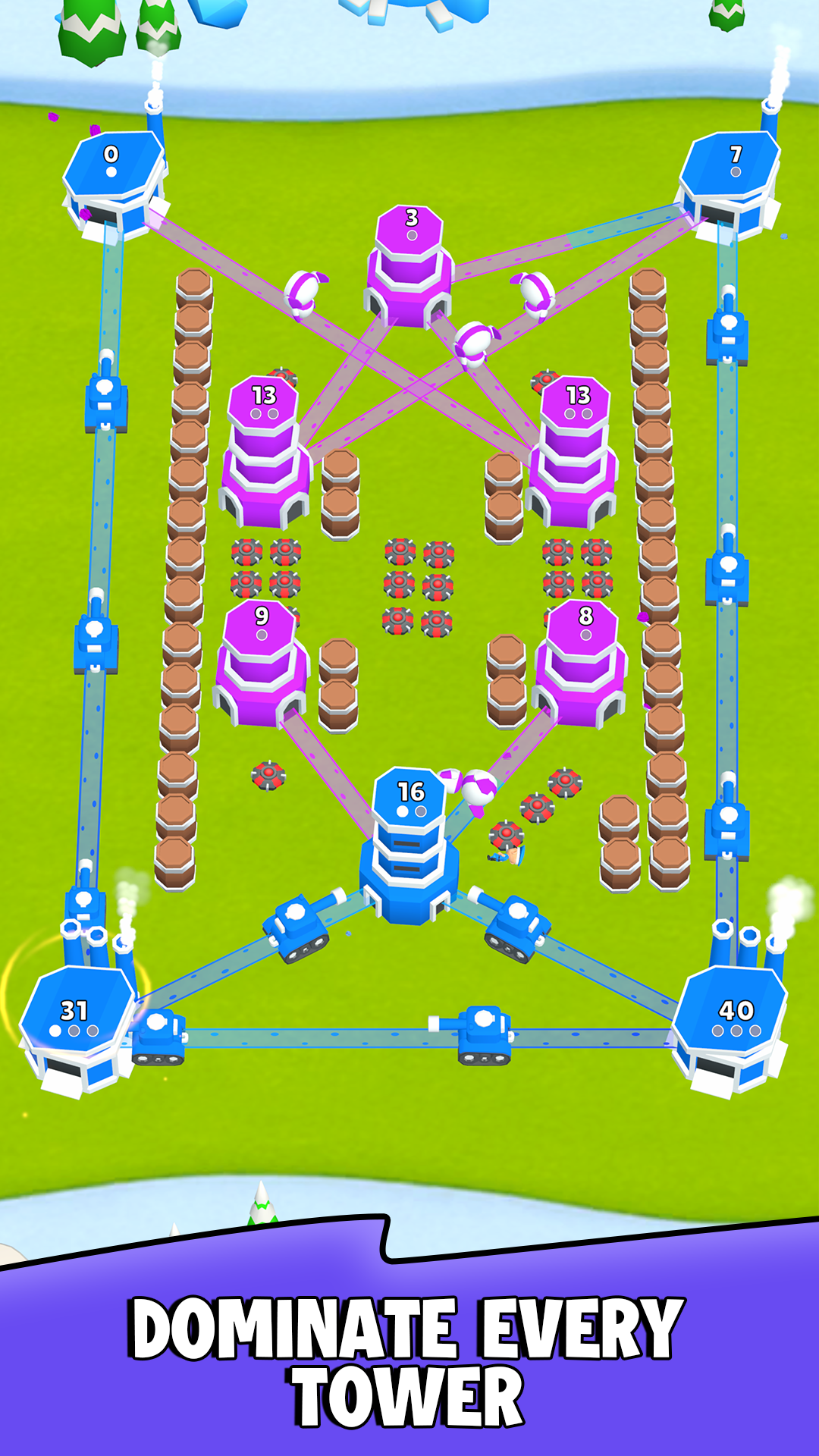 Human vs Robot: Tower war — динамичная стратегия где ты всегда за людей и сражаешься с ордами машин за контроль над полем боя. Ты проводишь пальцем по экрану, соединяешь свои башни с вражескими, отправляешь войска по проложенным путям и смотришь как они маршируют, атакуют и захватывают укрепления. В каждом уровне приходится анализировать карту, планировать маршруты чтобы обойти оборону роботов, активировать отправки и корректировать ход боя на лету пока враги контратакуют. За пять минут можно нарисовать пару путей, запустить волну, отбить ответную атаку и почувствовать как поле меняет хозяина; это держит в тонусе и заставляет думать быстро.