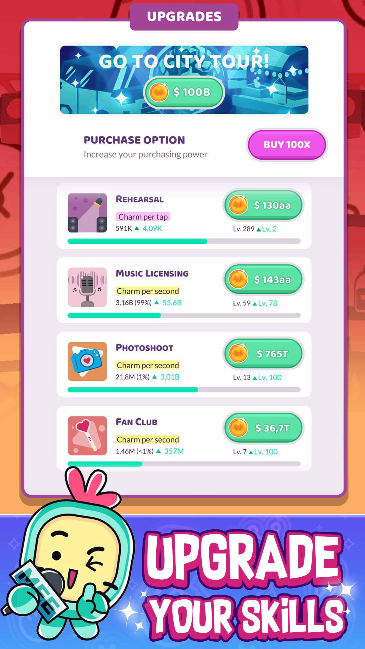 Idle Idol это игра про медленный, но уверенный путь к сцене, где вы начинаете с небольших квартирных концертов и шаг за шагом превращаете свои записи в хиты. Игровой цикл прост и увлекатель: записываете треки, улучшаете навыки исполнителя, вкладываете доход в рекламу и шоу, наблюдаете за ростом аудитории и повторяете эти действия, пока очередной трек не взлетит; в этом есть своя магия и азарт, потому что каждое решение меняет траекторию карьеры и подкидывает неожиданные повороты. Повествование слегка приоткрывает завесу индустрии и оставляет интригу о том, кто окажется вашим главным соперником на вершине сцены.