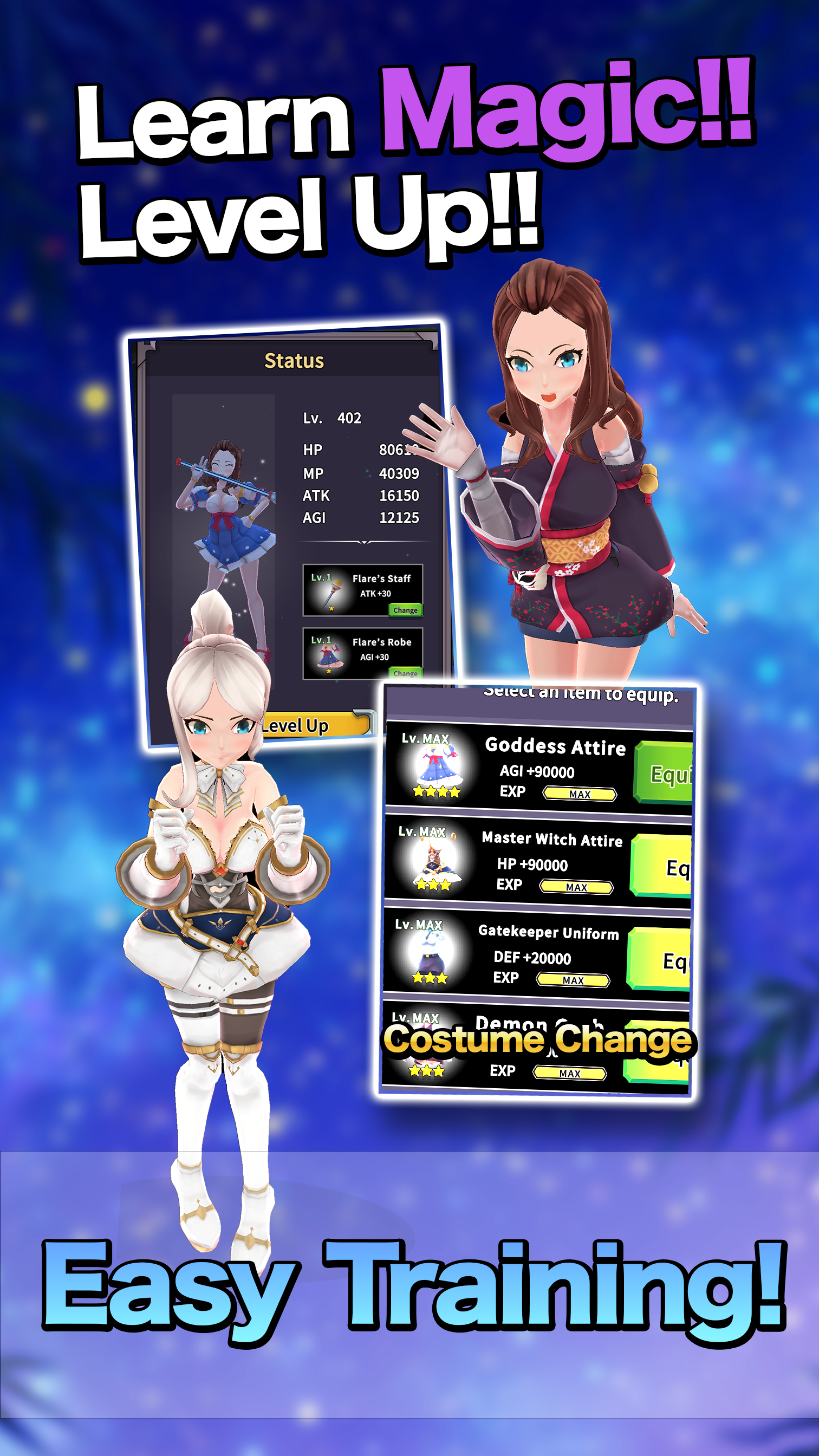Witch Growth — idle-кликер RPG в аниме-стиле, где ты ведёшь свою ученицу Флэр в мир добычи монет и сражений. В каждом клике ты усиливаешь удары, апгрейдишь заклинания и смотришь, как героиня растёт от новичка до легендарной ведьмы. Сосредоточься на простом основном цикле: клик, сбор, апгрейд, повтор. По пути встречаются редкие события и тайные сундуки которые меняют ход игры и оставляют лёгкую интригу о скрытых эволюциях, так что чувство прогресса не даёт остановиться и притягивает как магнит до следующего апгрейда.
